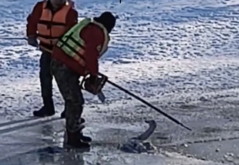 Задля порятунку птаха довелось бензопилою різати лід на річці.
